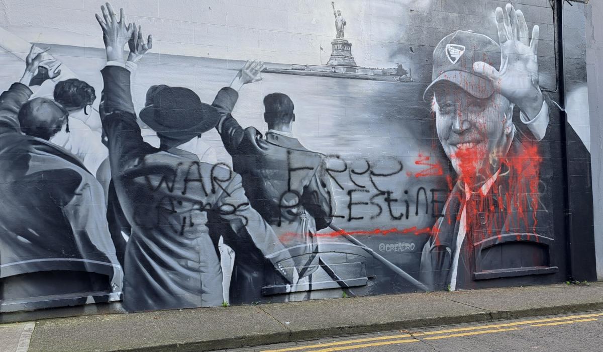 The Joe Biden mural at Bachelors Walk in Dundalk appears to have been vandalised in the last few days with the words “War Crimes” and “Free Palestine” daubed over the work along with what appears to be red paint.
