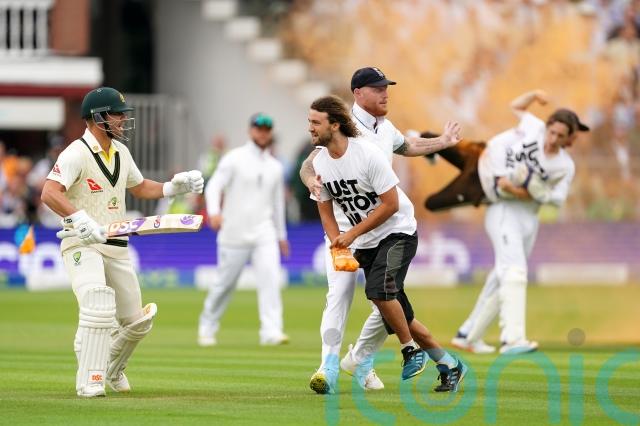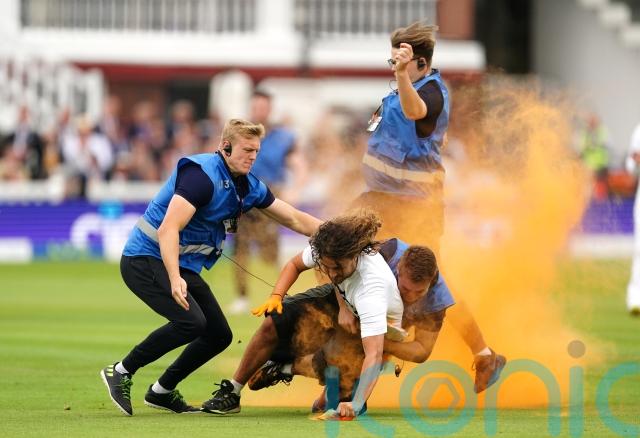 Just Stop Oil said on Twitter: “At 11am, three Just Stop Oil supporters stormed the pitch at Lord’s Cricket Ground in a cloud of orange powder paint and disrupted the #Ashes2023 Second Test between England and Australia.”