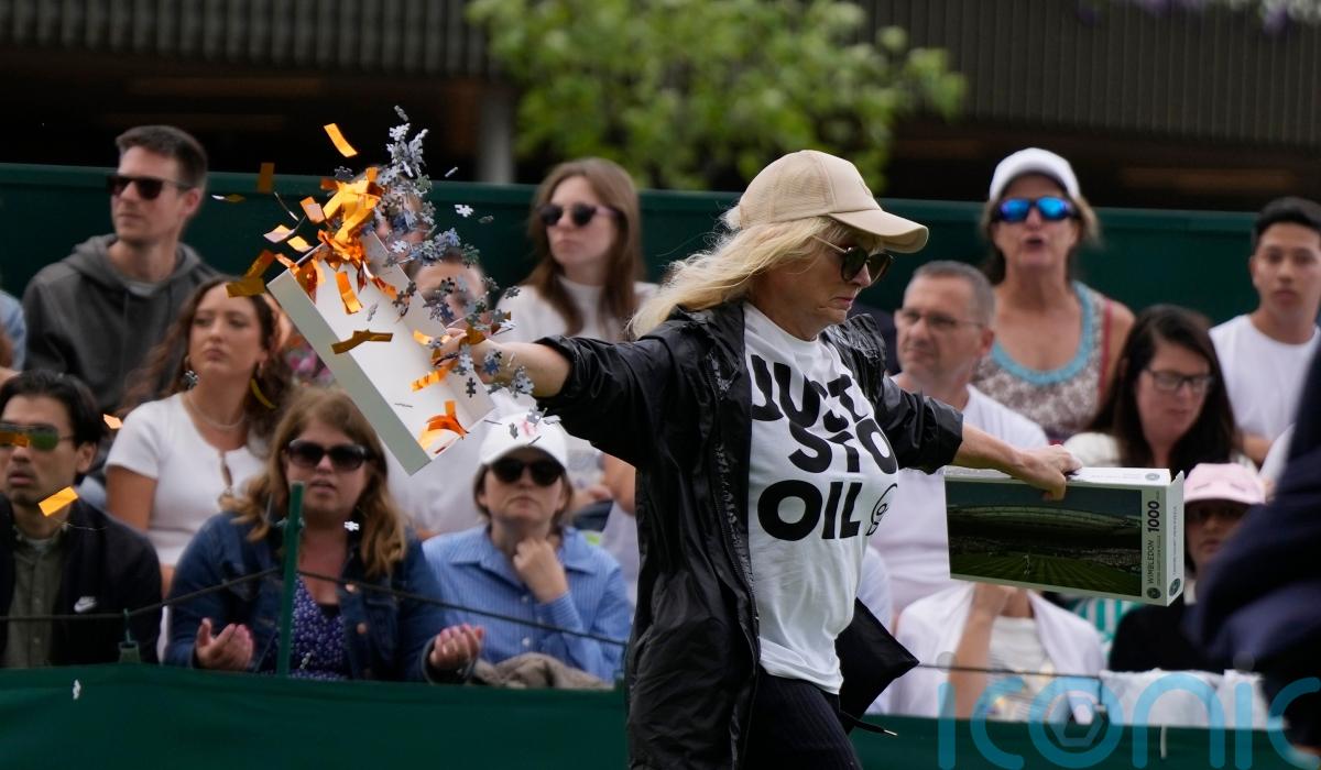 Two Just Stop Oil protesters have been arrested after disrupting Wimbledon by throwing orange-coloured confetti and jigsaw pieces on Court 18.