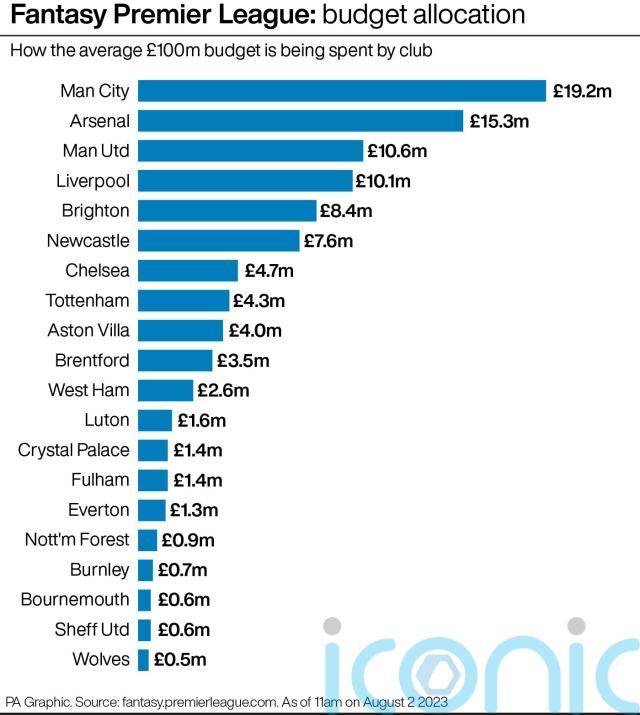 Manchester United (£10.6m) and Liverpool (£10.1m) players are attracting investment too, while Brighton (£8.4m) and Newcastle (£7.6m) are proving more popular than Chelsea (£4.7m) and Tottenham (£4.3m) despite having tougher early fixtures.
