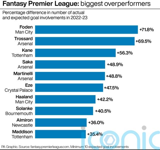 Leandro Trossard registered a similar level of overperformance across spells at Arsenal and Brighton, while Tottenham’s Harry Kane racked up 56 per cent more goals and assists than the average player might have managed in the same situations.