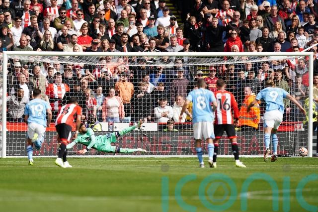 City were gifted the chance to take a first-half lead when Alvarez’s cross struck John Egan on the arm as the Blades skipper slid in to block and referee Jarred Gillett pointed straight to the spot.