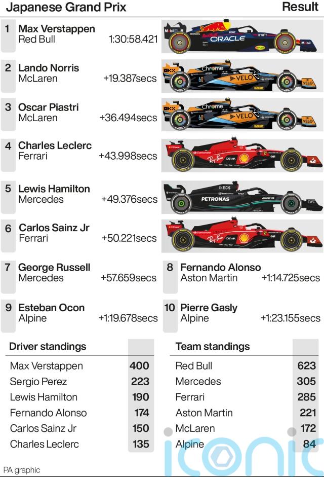 Verstappen was imperious around the high-speed corner circuit at Suzuka, beating McLaren’s Lando Norris by over 19 seconds as Red Bull sealed the constructors’ championship with a record six races to spare.