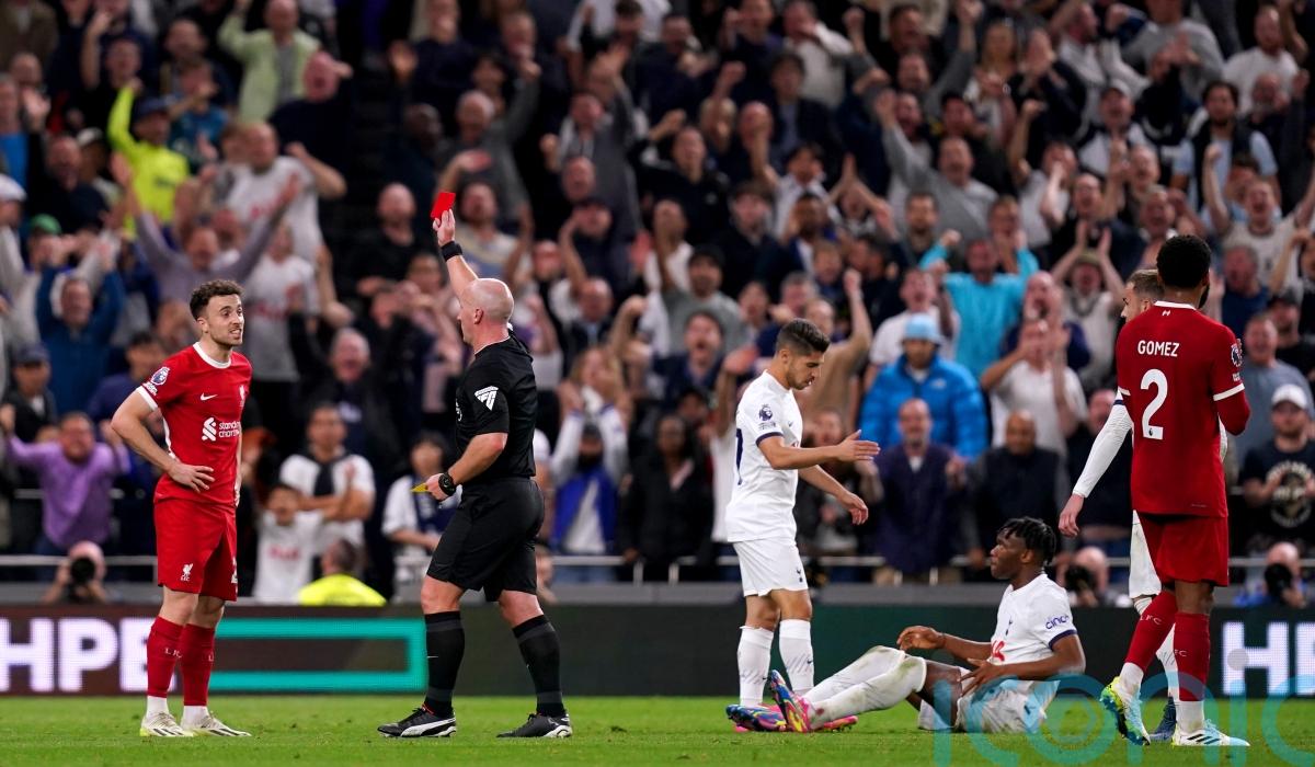 Liverpool defender Curtis Jones was shown a straight red in the first half after VAR intervention for a foul on Yves Bissouma and the visitors were incensed when Luis Diaz’s opening goal was incorrectly ruled out for offside.