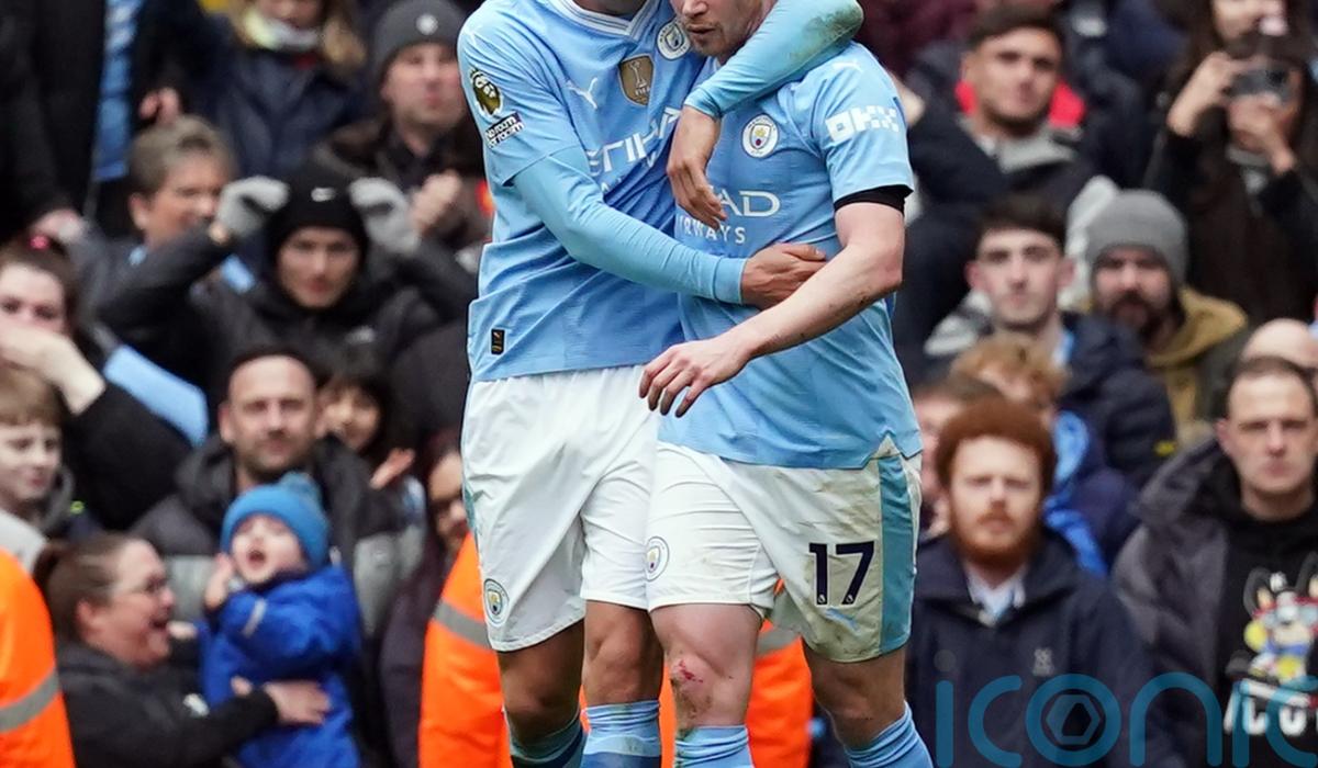 Erling Haaland scored his first goals since November as champions Manchester City finally wore down Everton to claim a hard-fought 2-0 Premier League win on Saturday.