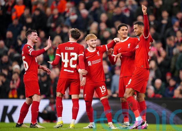 Veljko Birmancevic held off the backtracking Wataru Endo to poke a shot past Caoimhin Kelleher just before the break but it was a brief respite as, after Nunez, Endo and Joe Gomez were replaced during the interval, Szoboszlai’s near-post drive took a deflection on the way in.