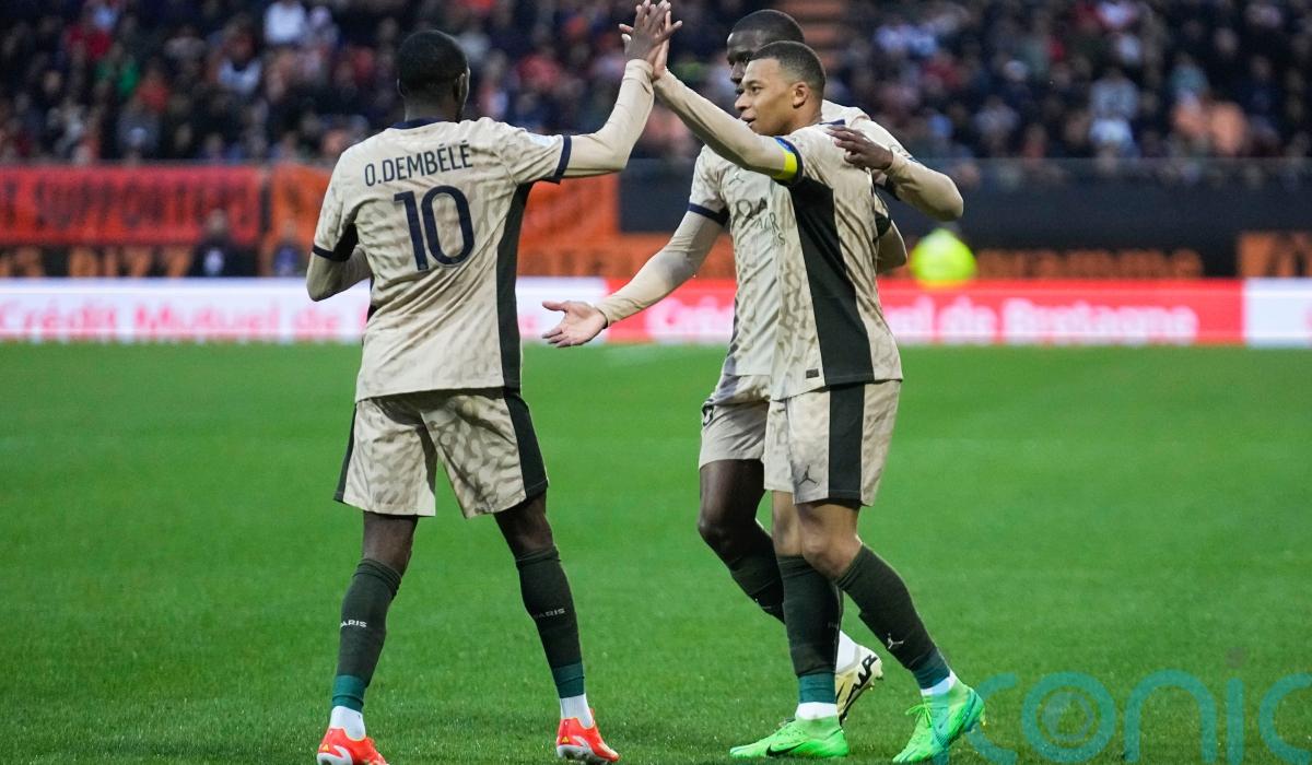 Kylian Mbappe and Ousmane Dembele each scored twice as Paris St Germain moved to the brink of sealing another Ligue 1 title with a 4-1 win at Lorient.