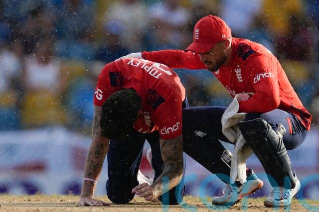 England were unable to call upon Reece Topley at the death as the left-armer jarred his right knee after an awkward tumble in his delivery stride just before a half-hour rain delay.