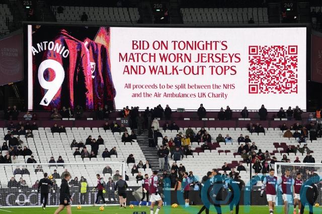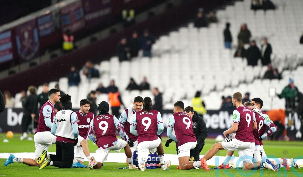 West Ham’s squad warmed up in Antonio shirts ahead of their match against Wolves on Monday evening to show support for their stricken team-mate.