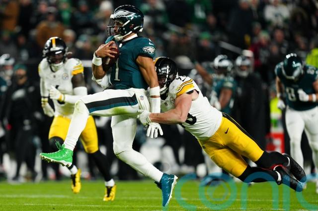 Jalen Hurts threw for two touchdowns and went over from short range himself as the Eagles won a franchise-best 10th consecutive game.
