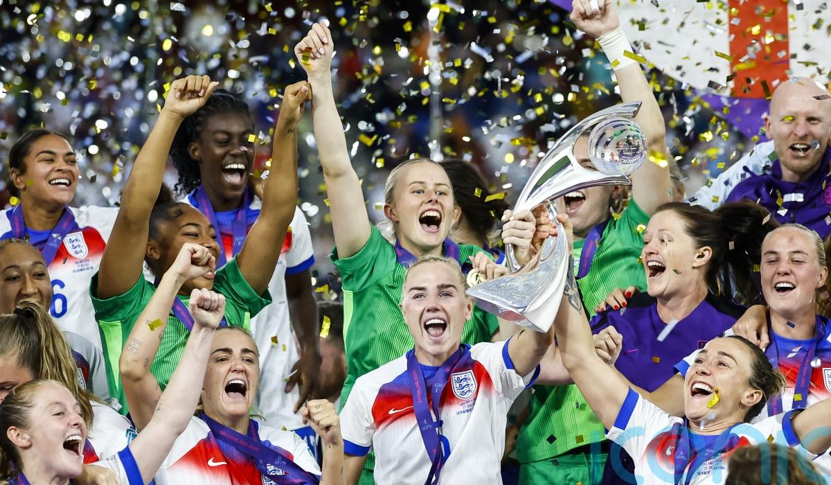 Videos from the Lioness’ accounts show the jubilant team running across the pitch and cheering as they roll around in gold and silver streamers and confetti.