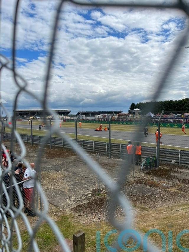 The Alfa Romeo of Zhou Guanyu slid upside down across the track before slamming into the tyre barrier and being launched into the fencing in a major crash at the start of the Silverstone race.