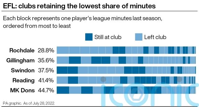 As it stands, clubs have retained an average of 69 per cent of minutes from last season in the Championship, compared with 65 per cent in League One and 57 per cent in League Two.
