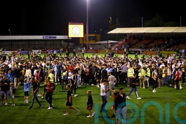 Despite warnings on the public address system and footballing authorities threatening stricter punishments this campaign, many home fans spilled on to the pitch at full-time.