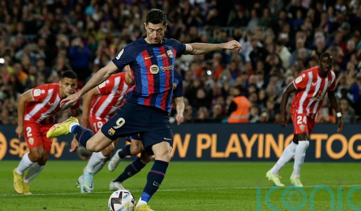 Robert Lewandowski missed a penalty as defender Gerard Pique ended his distinguished Barcelona career with a 2-0 win over Almeria.