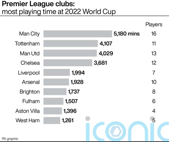 While Norway’s absence means star striker Erling Haaland goes into Thursday’s League Cup clash with Liverpool on 39 days’ rest, save for a friendly against Girona in which he scored, City led the league with 16 World Cup players combining for 5,180 minutes of action.